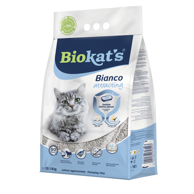 Biokat’s Bianco attracting satur sugas specifisko smaržas feromonu, kas kaķiem ir īpaši pievilcīgs. Šī viela var palīdzēt kaķiem atrast tualeti arī sarežģītās vai stresa situācijās. Tā rada drošības un uzticības sajūtu, kur kaķis jūtas labi. Biokat’s Bianco attracting ir piemērots visiem kaķiem, tostarp kaķēniem, kuriem vēl jāiemācās lietot kaķu tualeti.