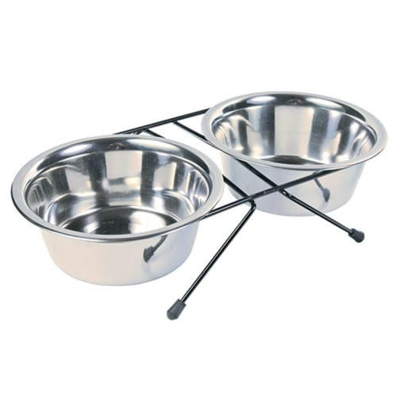 Statīvs ar bļodām kaķiem un suņiem, no nerūsējošā tērauda. Statīvs ir ar gumijas galiem, lai samazinātu slīdēšanu uz virsmas. Bļodas aprīkotas ar gumiju, kas nodrošina drošu fiksāciju un novērš bļodiņu troksni dzīvnieka ēšanas laikā Statīvs ar bļodām no nerūsējošā tēraudas, ar neslīdošām gumijas kājām. Neslīdošs statīvs palīdzēs jums uzturēt kārtību mājās un jūsu mājdzīvniekam būs īpaši ērti ēst, jo bļodas statīvs neslīd. Bļodas ideāli der gan ūdenim, gan barībai. Bļodas var mazgāt trauku mazgājamā mašīnā.