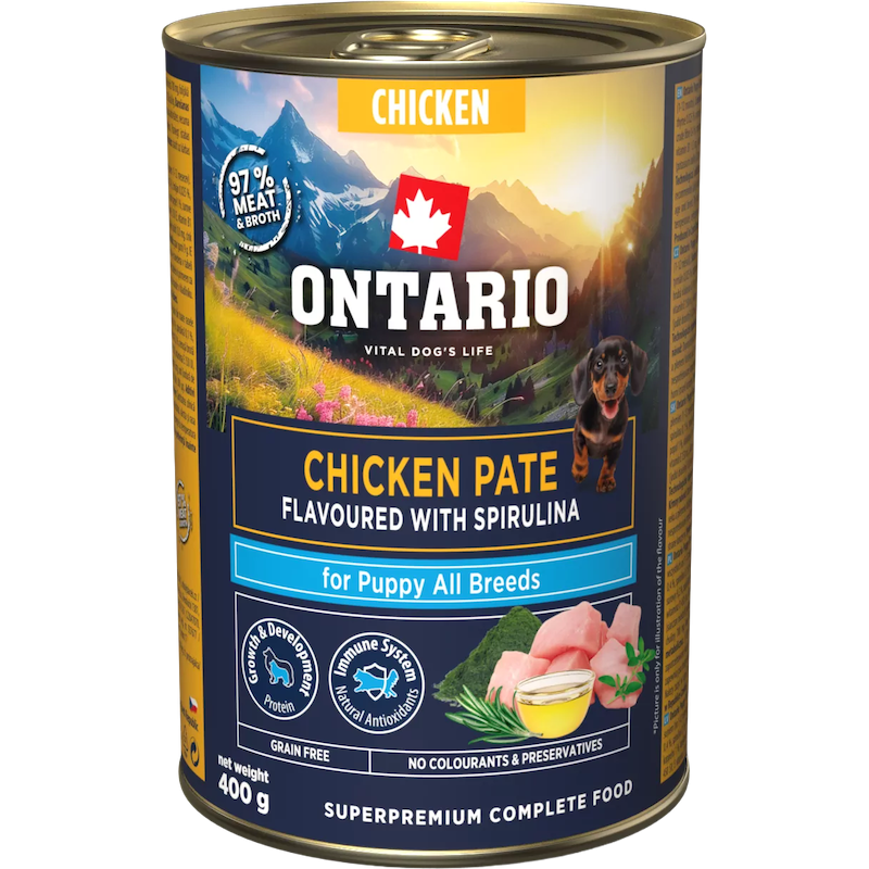 Konservi kucēniem - Ontario Puppy chicken pate with spirulina flavor 400g