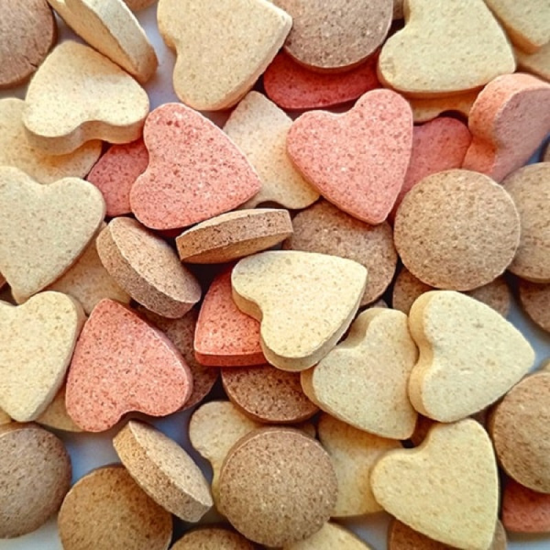 - Vienā paciņā ir 3 dažādu veidu vitamīni - sirsniņas ar biotīnu un taurīnu, sirsniņas ar proteīnu un aplīši ar aknu garšu;