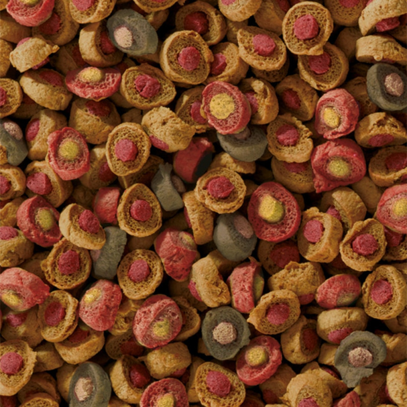 Sastāvdaļas: zivju milti, kukurūzas ciete, kviešu milti, kviešu lipeklis, alus raugs, kviešu dīgļi, Ca-kazeināts, spirulīna, zivju eļļa (kas satur 49% omega taukskābes), mannāna oligosaharīdi (0,4%), krils, gammarus, zaļganu gliemene , dzeloņainas nātres, lucerna, garšaugi, hematokoku aļģes, pētersīļi, jūras aļģes, paprika, spināti, ķiploki, burkāni.